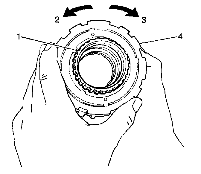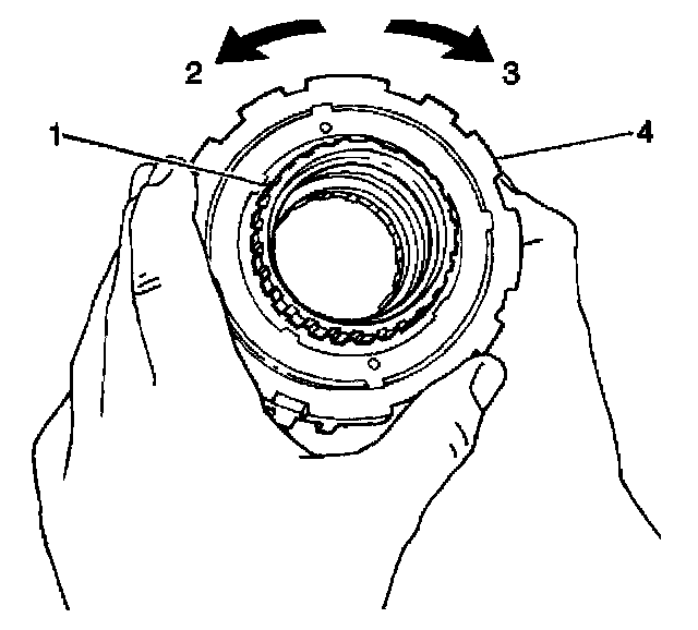 2. The underdrive one-way clutch should turn freely in a counterclockwise direction (2) and should not turn in a clockwise direction (3). If the underdrive one-way clutch is installed correctly on the underdrive clutch drum and the underdrive one-way clutch can be turned clockwise, replace the underdrive one-way clutch.