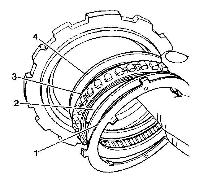 6. Remove the underdrive one-way clutch retainers (2, 4) and the sprag assembly (3) from the underdrive one-way clutch outer race.