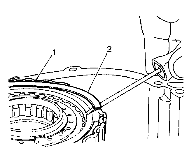 9. Use a J23327 with a J37279 to remove the underdrive clutch piston return spring snap ring (1) from the underdrive piston return spring (2).