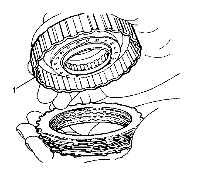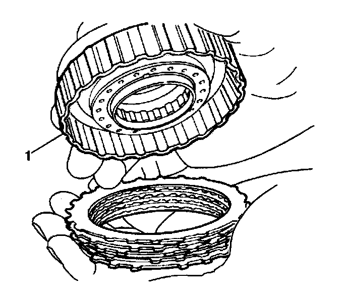 6. Install the 4 discs, 4 plates and underdrive clutch flange into the underdrive clutch drum (1) in the following order: