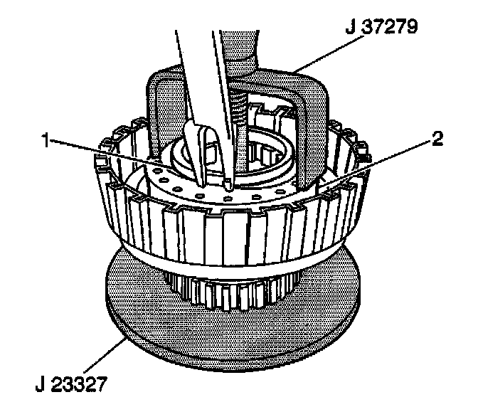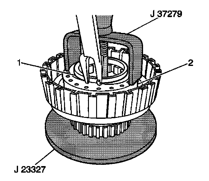 5. Use a J23327 with a J37279 to install the underdrive clutch piston return spring snap ring onto the underdrive piston return spring (2).