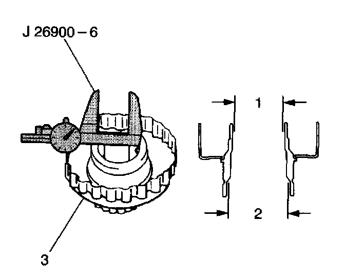 19. Use a J26900-6 to measure the inside diameter of the front and rear underdrive clutch flange (3) bushings.