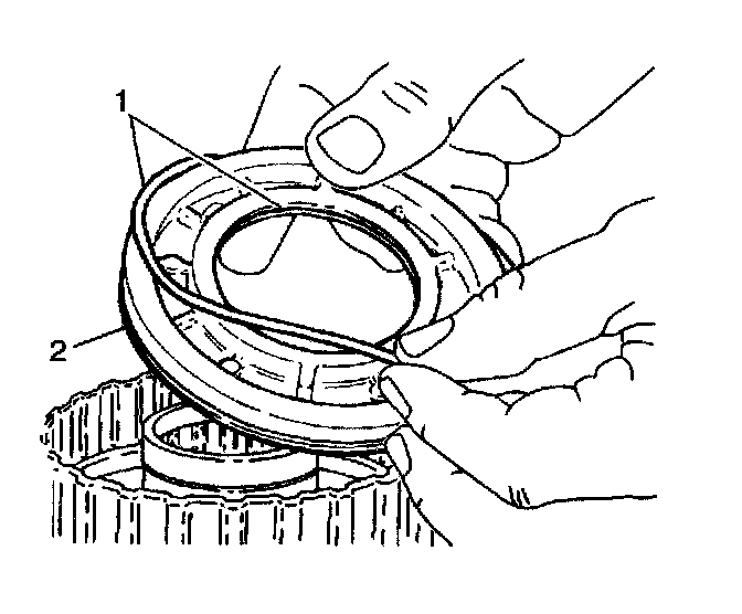 1. Install the two underdrive clutch piston seals (1) onto the underdrive clutch piston (2).