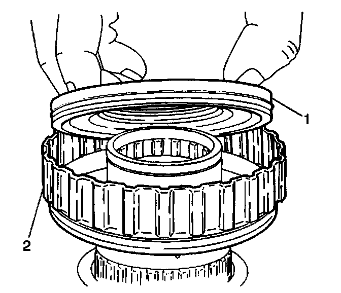 7. Remove the underdrive clutch snap ring (2) from the underdrive clutch drum (1).