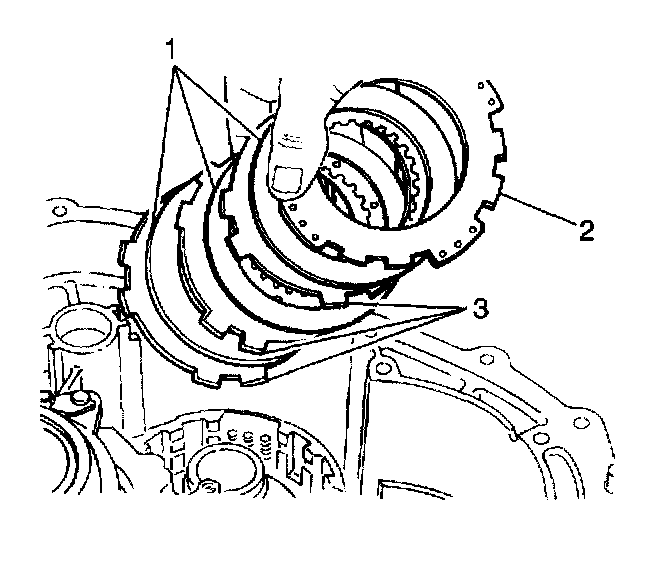 6. Install the underdrive brake flange (2), three plates (3) and three discs (1) into the transaxle case in the following order:
