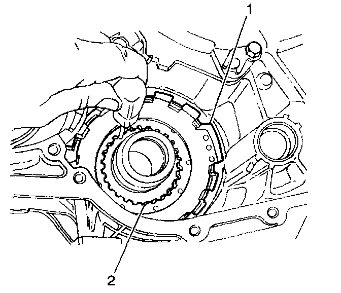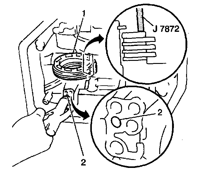 11. Measure the underdrive brake assembly (1) using a J7872. Apply 392 - 785 kPa (57 - 114 psi) of compressed air into the underdrive brake apply passage (2).