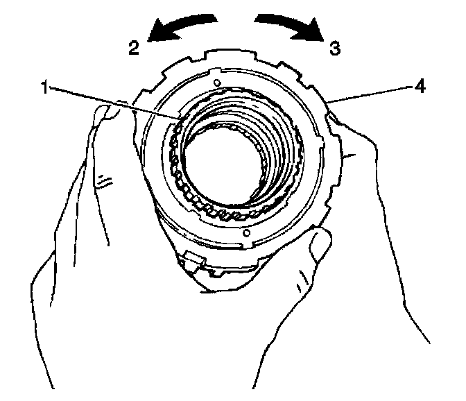 1. Inspect the underdrive one-way clutch for correct installation by simultaneously placing the underdrive one-way clutch onto the rear of the underdrive clutch drum (1), holding the underdrive clutch drum stationary and rotating the underdrive one-way clutch (4) by hand.