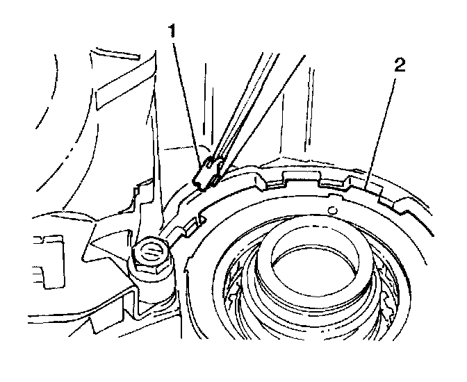^ Measure the installation depth from the top of the underdrive clutch drum support (2) to the top of the underdrive clutch drum (1). The underdrive clutch assembly installation depth should fall within 17.3 - 18.2 mm (0.681 - 0.717 inch).