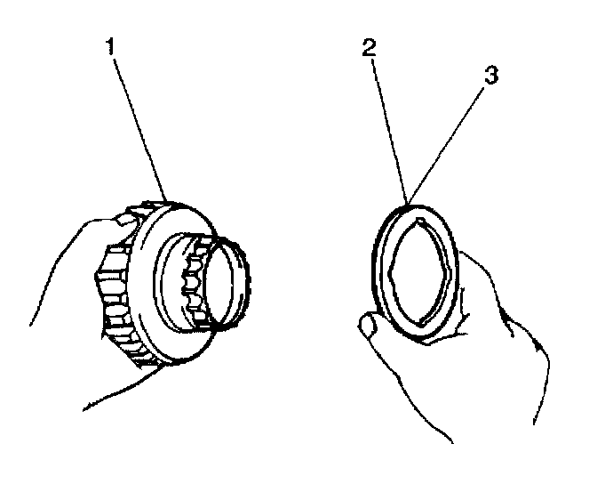 ^ The underdrive one-way clutch must turn freely in a counterclockwise direction (2) for correct installation. If the underdrive one-way clutch turns freely in a clockwise direction (3), the underdrive one-way clutch is installed backwards (upside down).
