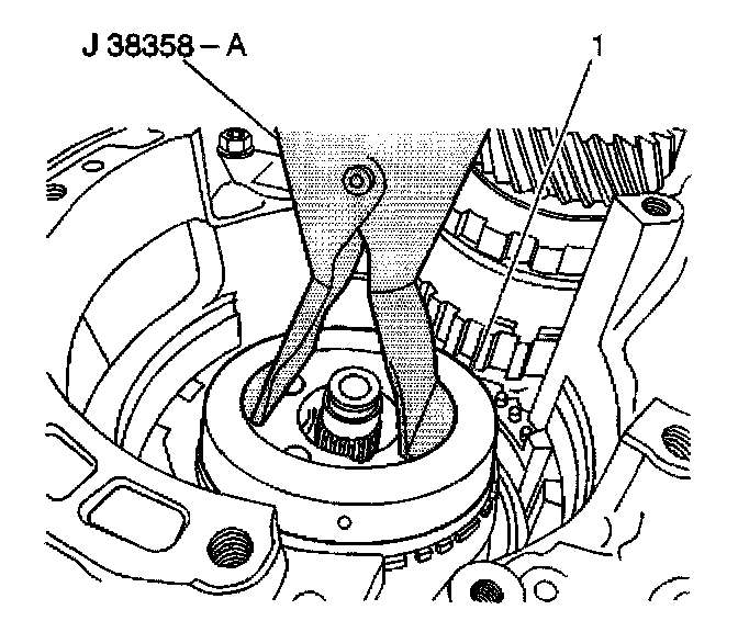 1. Use the J38358-A in order to remove the low one-way clutch snap ring (2) from the transaxle case.