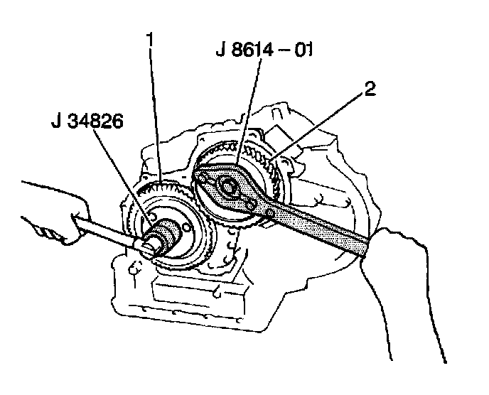 3. Install the J8614-01 onto the countershaft driven gear (2) in order to hold the countershaft driven gear (1) stationary during the removal of the intermediate shaft lock nut.