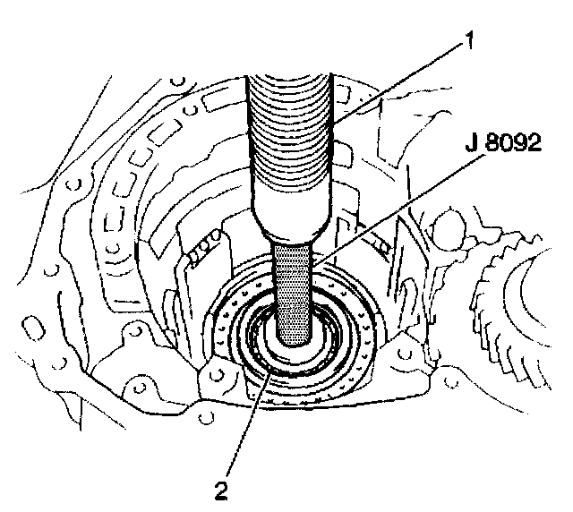 11. Use the J37758 with the J8092 and a hydraulic press in order to remove the countershaft drive gear outer race from the transaxle case.