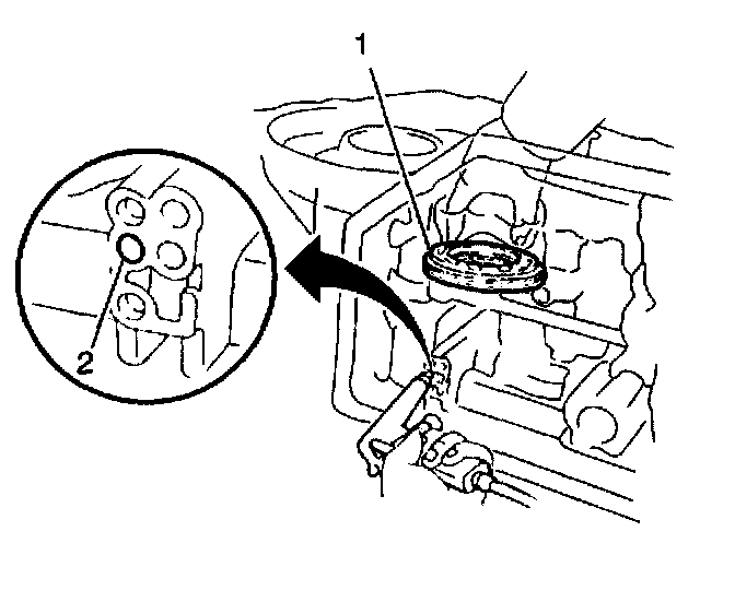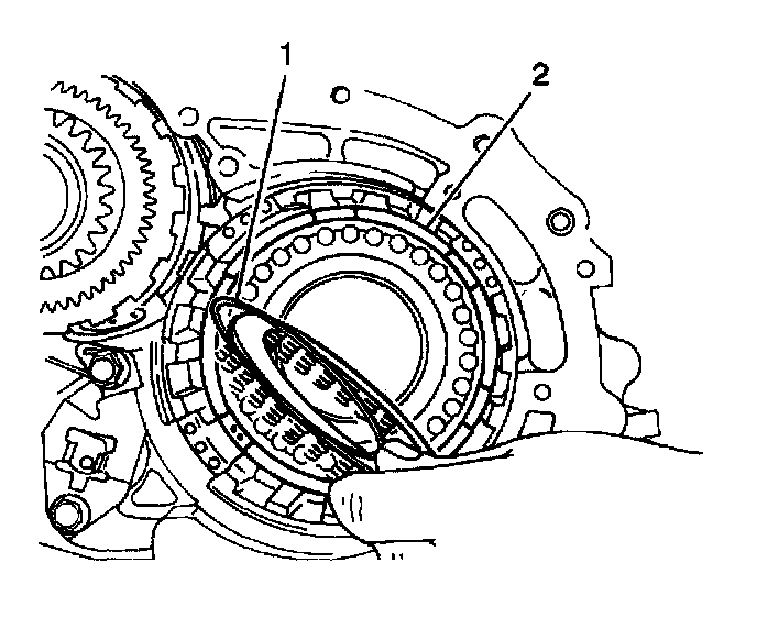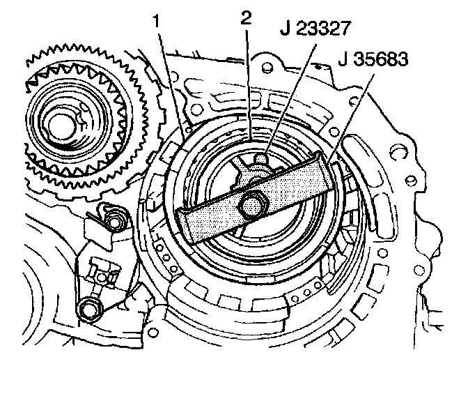 1. Install the J23327 with a J35683 and compress the 1st-reverse brake piston return spring until the 1st-reverse brake piston return spring snap ring (2) can be removed.