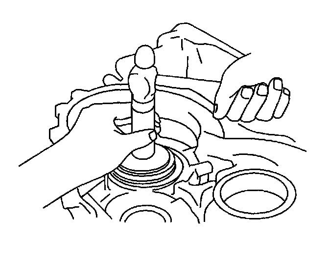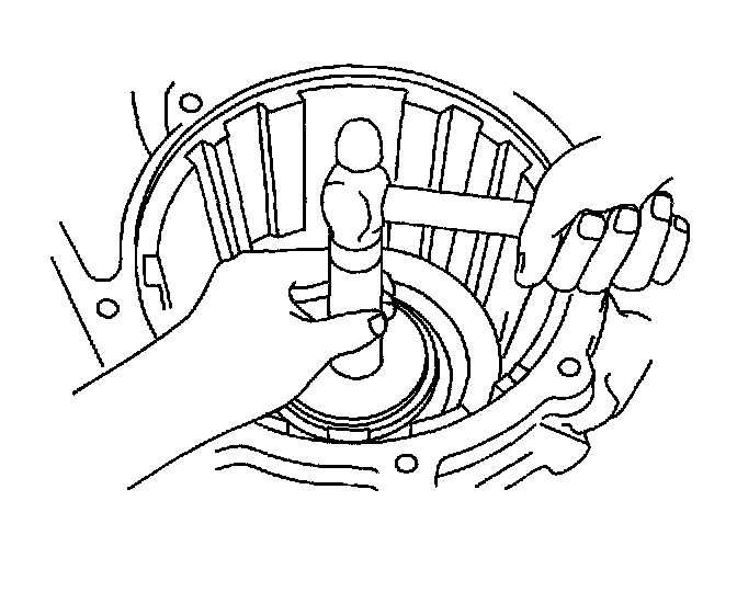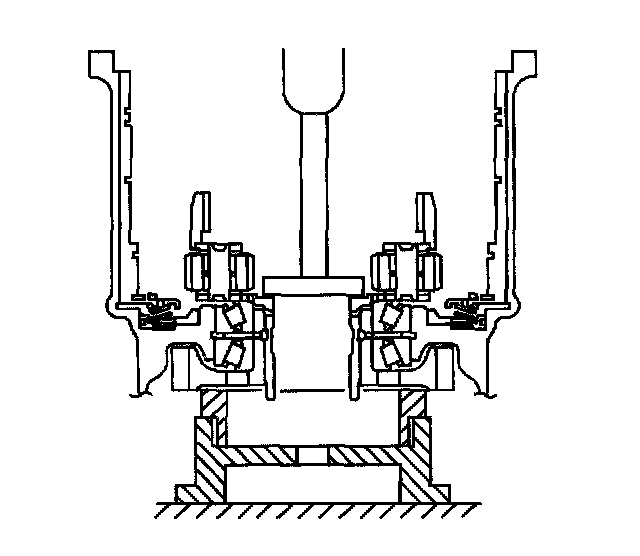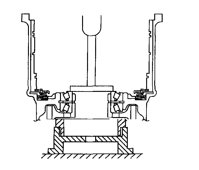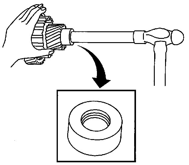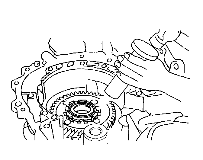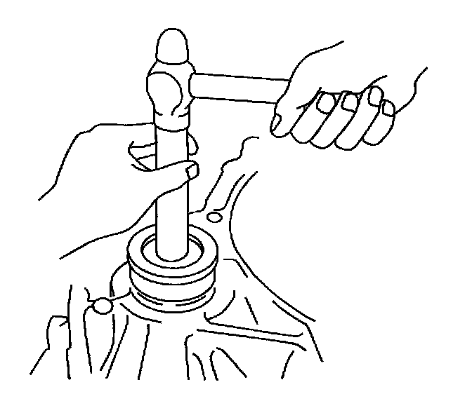 121. Using a bearing driver and hammer, install the front drive pinion rear tapered roller bearing into the transaxle case.