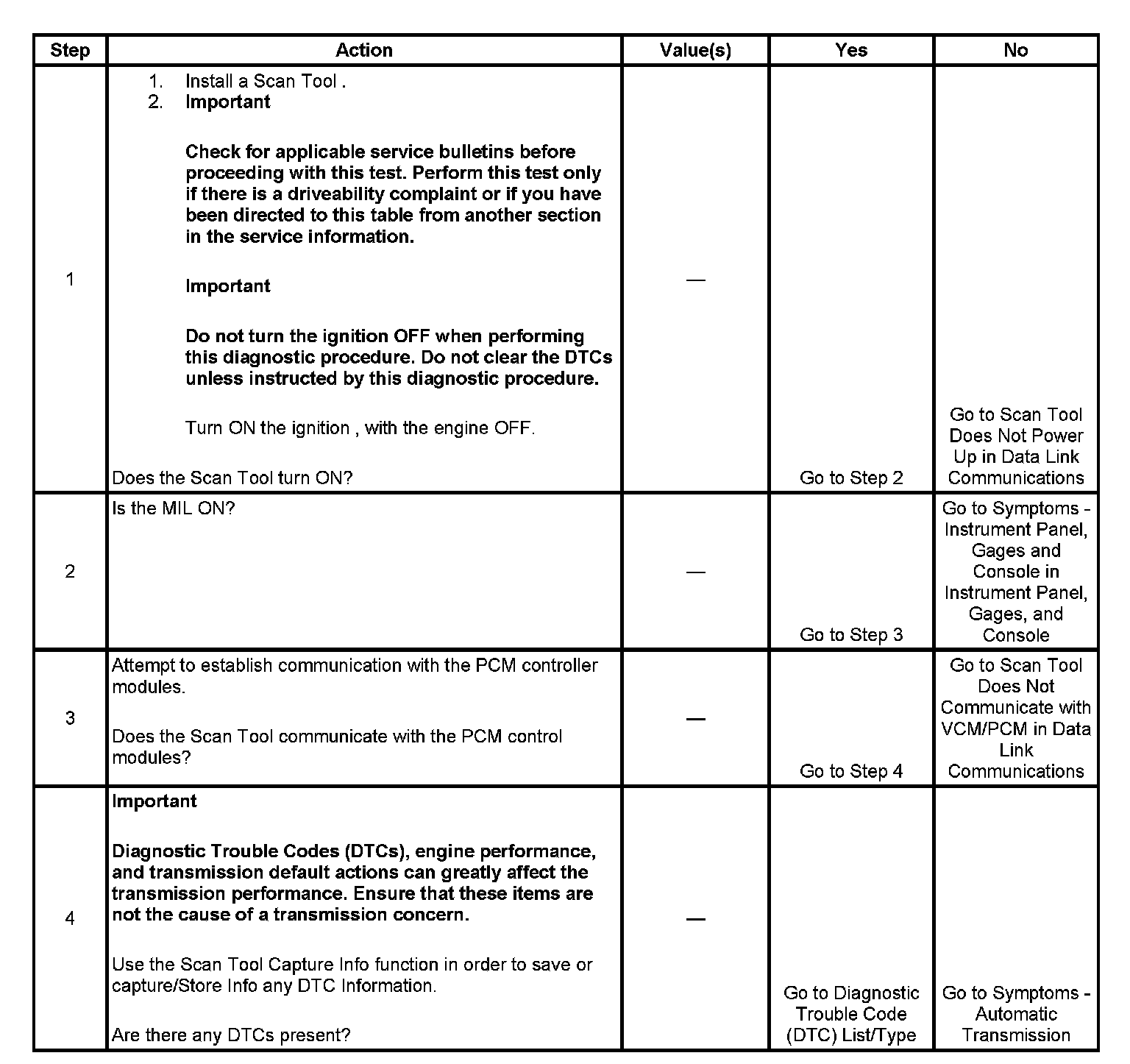 The Automatic Transmission Diagnostic System Check is an organized approach to identify a problem created by an automatic transmission. The Diagnostic System check is the diagnostic starting point for an automatic transmission complaint. The Diagnostic System Check directs you to the next logical step for diagnosing a transmission concern. Perform this check only if there is a driveability complaint or if you have been directed here from another service information section.