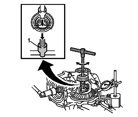11. Using a torque wrench (1) and J 46004, measure and record the drive pinion starting preload. Preload should be between 0.4 - 0.7 Nm (3 - 6 inch lbs.).