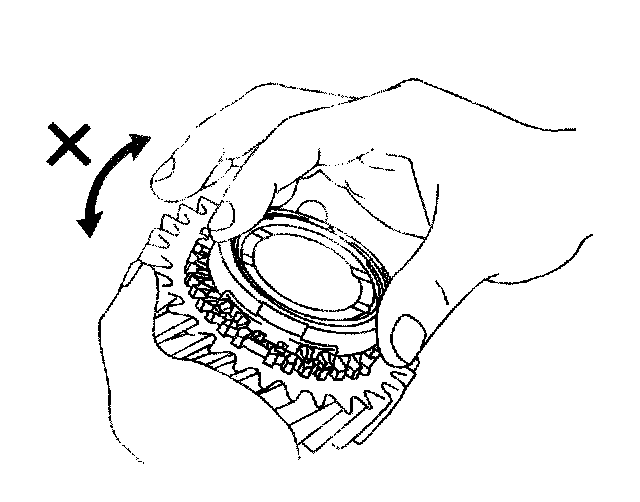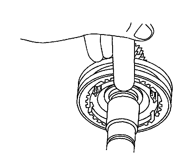 9. Check the 1st gear braking action of the synchronizer ring. Turn the synchronizer ring in one direction while pushing it into the gear cone. Ensure that the ring locks. Replace the ring if necessary.