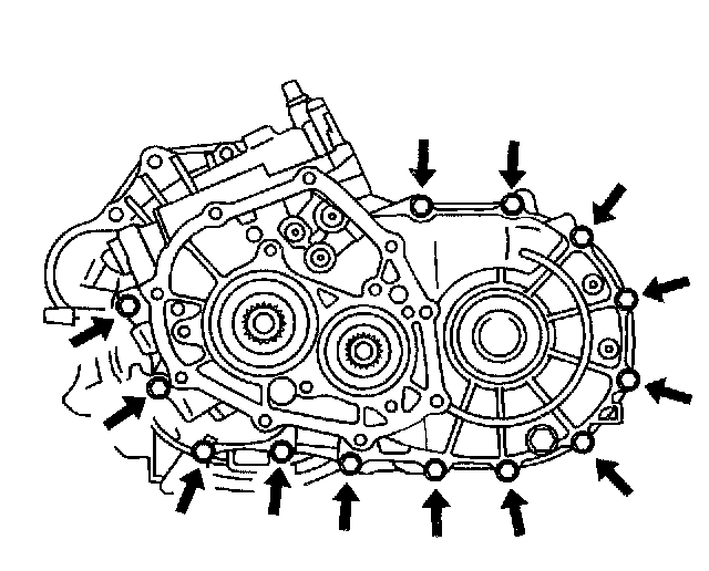 74. Install the 13 transaxle case retaining bolts.