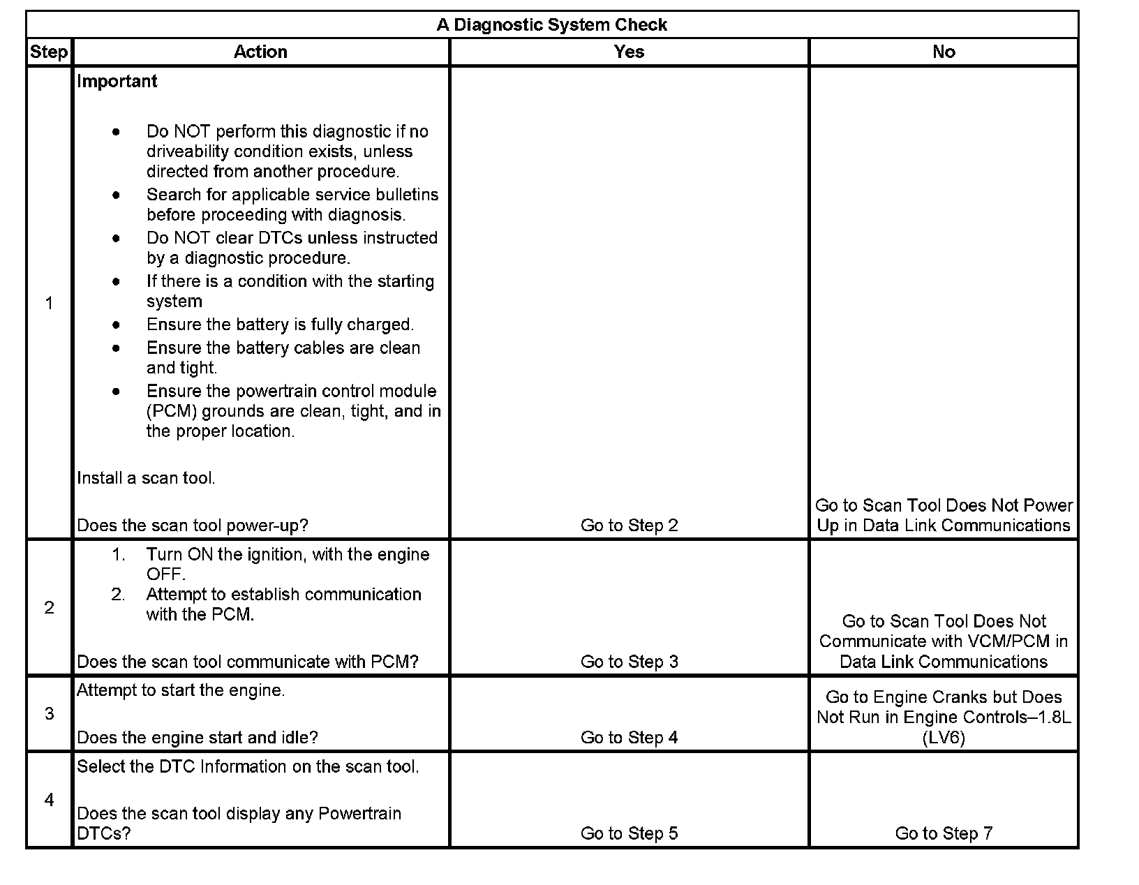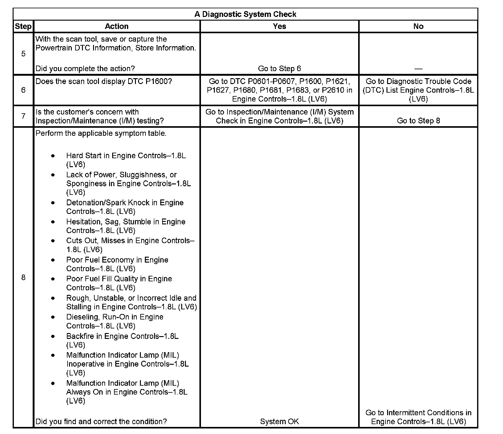 The Diagnostic System Check-Engine Controls is an organized approach to identifying a condition that is created by a malfunction in the engine control system. The Diagnostic System Check must be the starting point for any driveability concern. The Diagnostic System Check directs the service technician to the next logical step in order to diagnose the concern. Understanding and correctly using the diagnostic table reduces diagnostic time and prevents the replacement of good parts.