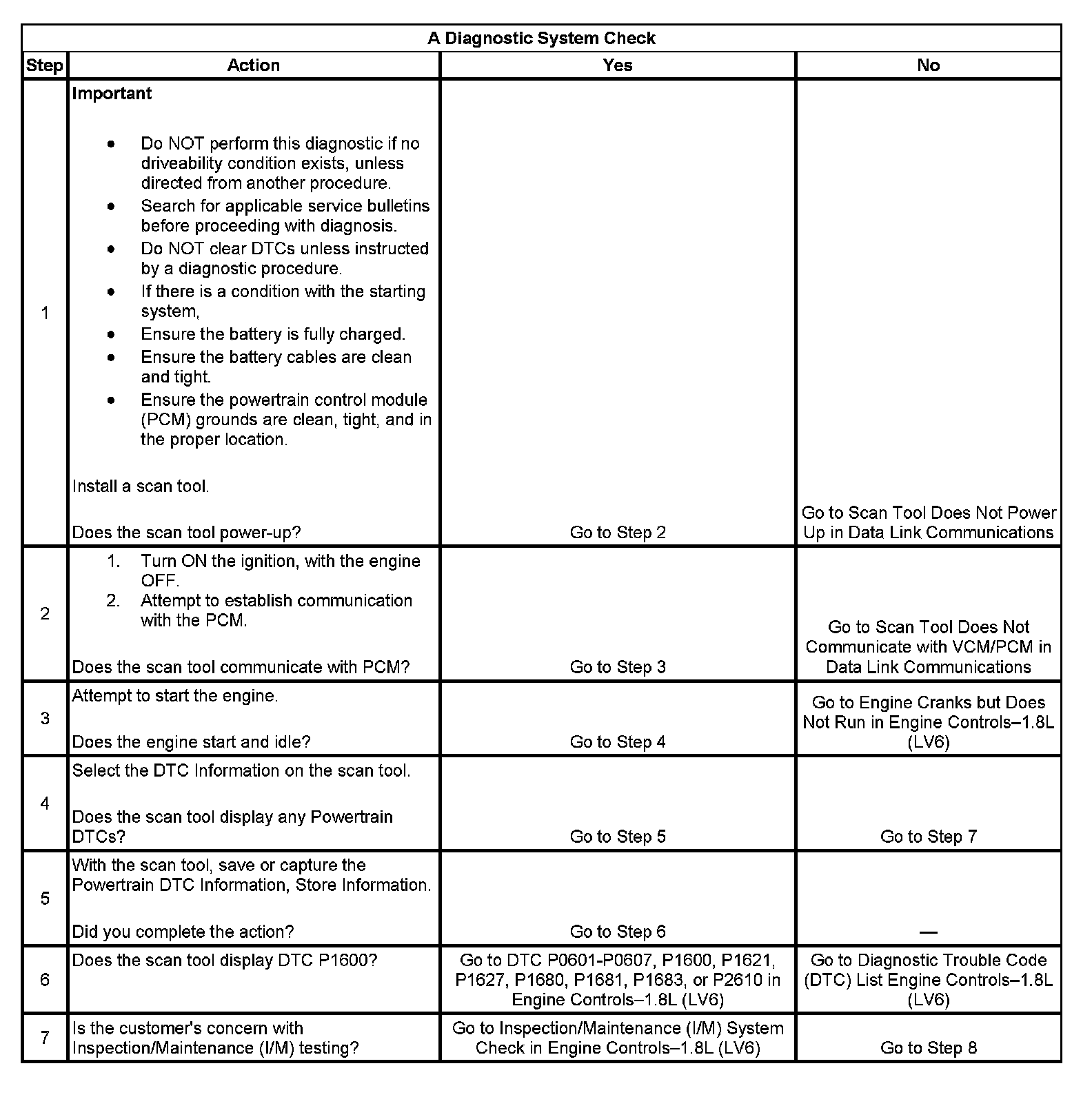The Diagnostic System Check-Engine Controls is an organized approach to identifying a condition that is created by a malfunction in the engine control system. The Diagnostic System Check must be the starting point for any driveability concern. The Diagnostic System Check directs the service technician to the next logical step in order to diagnose the concern. Understanding and correctly using the diagnostic table reduces diagnostic time and prevents the replacement of good parts.