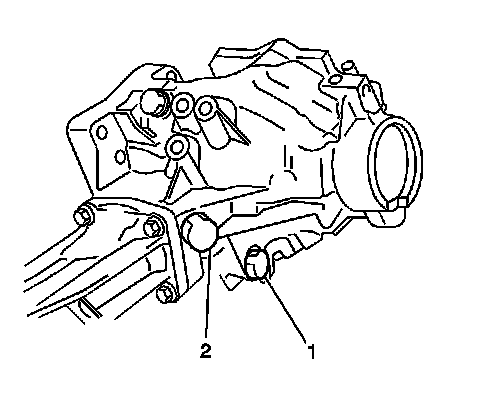 13. Add approximately 0.8 liters (1.7 pints) of 80W-90 API GL5 lubricant, or the equivalent, into the transfer case oil level/filler plug hole. The oil level should be even with the bottom of the oil level/filler plug hole (2).