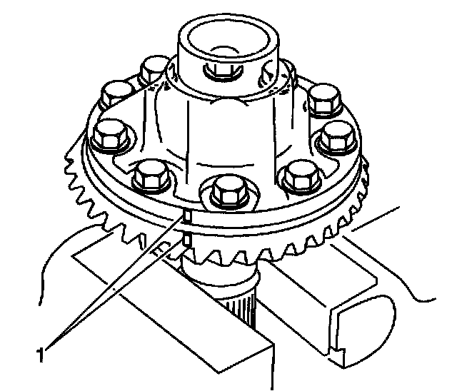 35. Place alignment marks (1) on the ring gear and the mounting case.