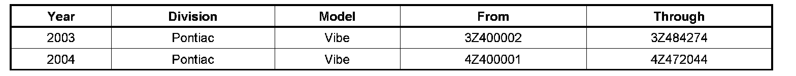 Involved are all 2003-2004 model year Pontiac Vibe vehicles equipped with power windows and built within the VIN breakpoints shown above.