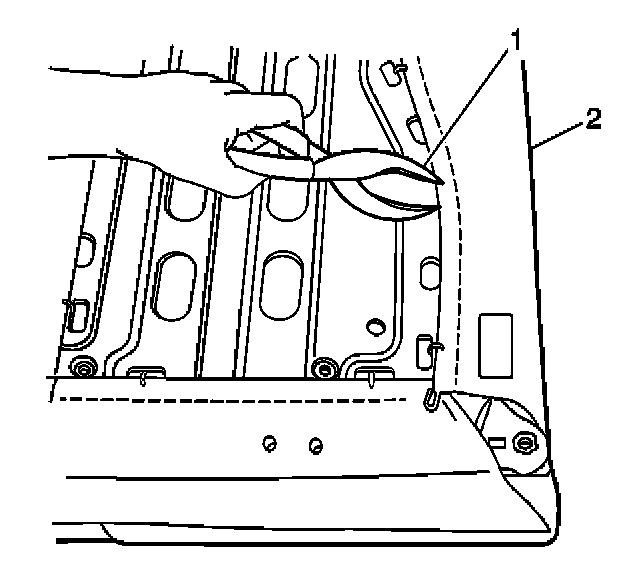 2. Use hog ring pliers (1) to install new hog rings. Ensure that the rear seat back cushion cover is secured to the cushion (2).