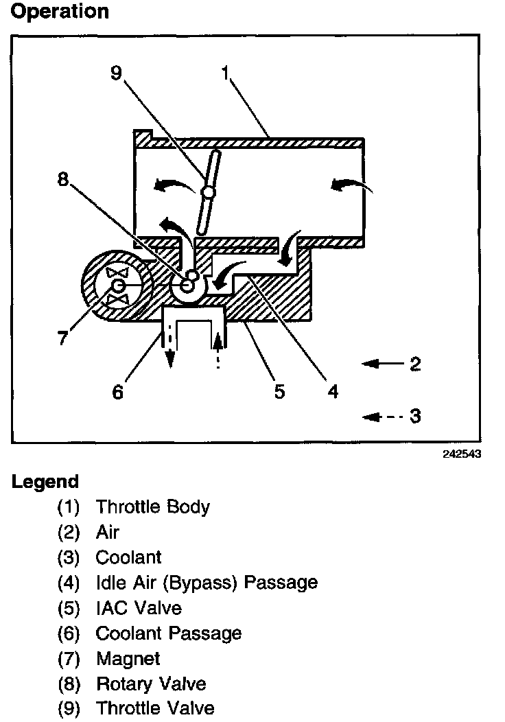 The PCM uses the IAC valve in order to control the engine idle speed. The PCM communicates with the IAC valve by varying the ON time of a repeating ON/OFF duty cycle. A magnet inside the IAC valve operates a rotary valve that controls the opening of the idle air bypass passage in the throttle body. The idle air passage allows air to enter the engine without passing over the throttle valve. The strength of the magnet in the IAC valve is related to the current flow in the IAC circuit.