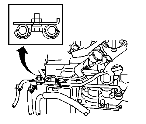 2. The fluid cooler inlet hose to the transaxle fluid cooler. Secure with the 1 clamp.