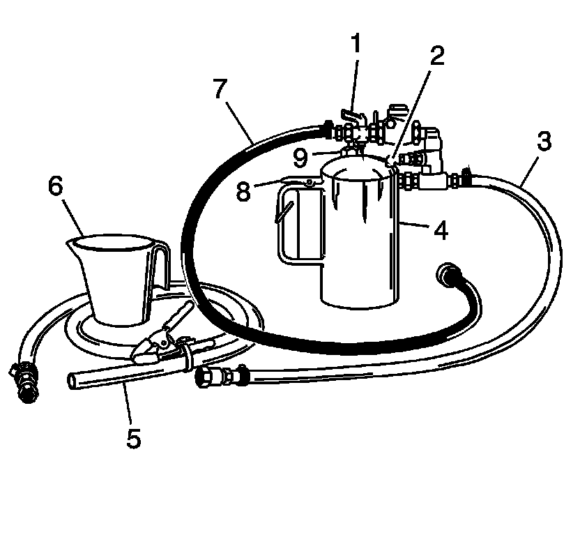 3. Install the fill cap (9) on the and pressurize the flusher tank (4) to 550 - 700 kPa (80 - 100 psi), using the shop air supply at the tank air valve (9).