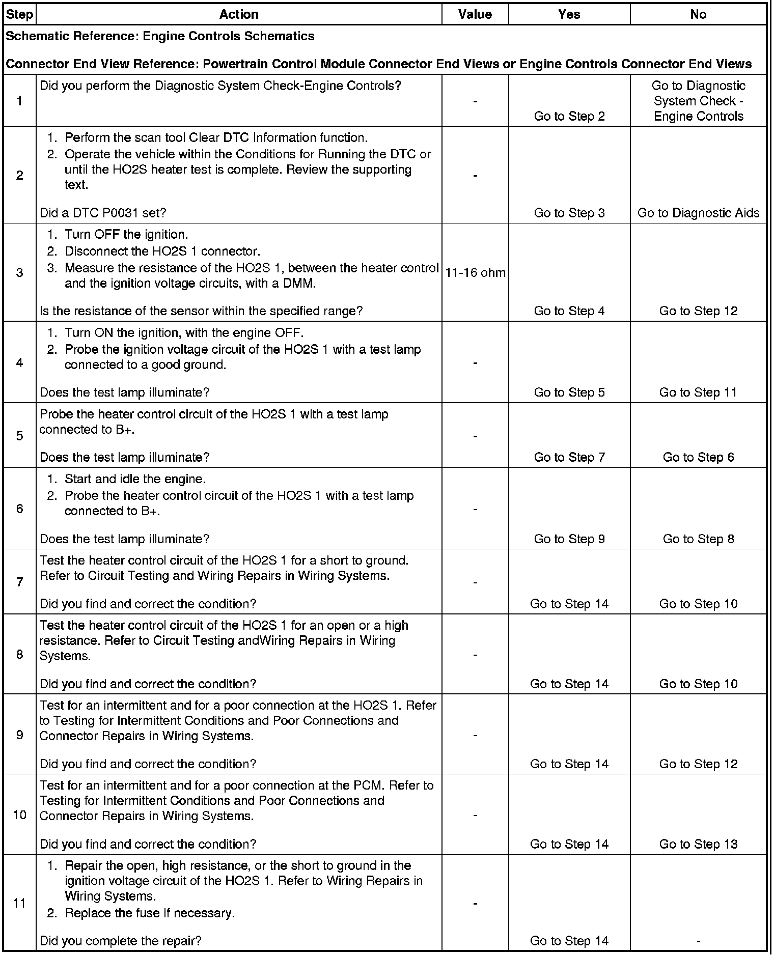 * The HO2S heater diagnostic checks for many of the faults that can cause DTC P0031 to set. If the HO2S heater test passes, the cause of the DTC is probably intermittent. Clear the DTC information. Road test the vehicle while monitoring the HO2S heater test in the I/M System Information selection on the scan tool. When the HO2S heater test indicates complete with a YES status, check for a DTC P0031 under Last Test Failed. If there is no DTC P0031 indicated, the DTC is intermittent and the HO2S heater diagnostic is indicating OK at this time.