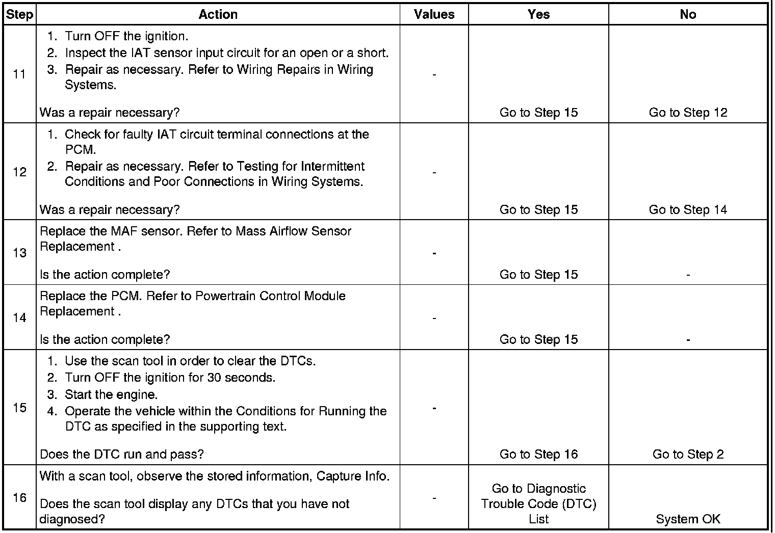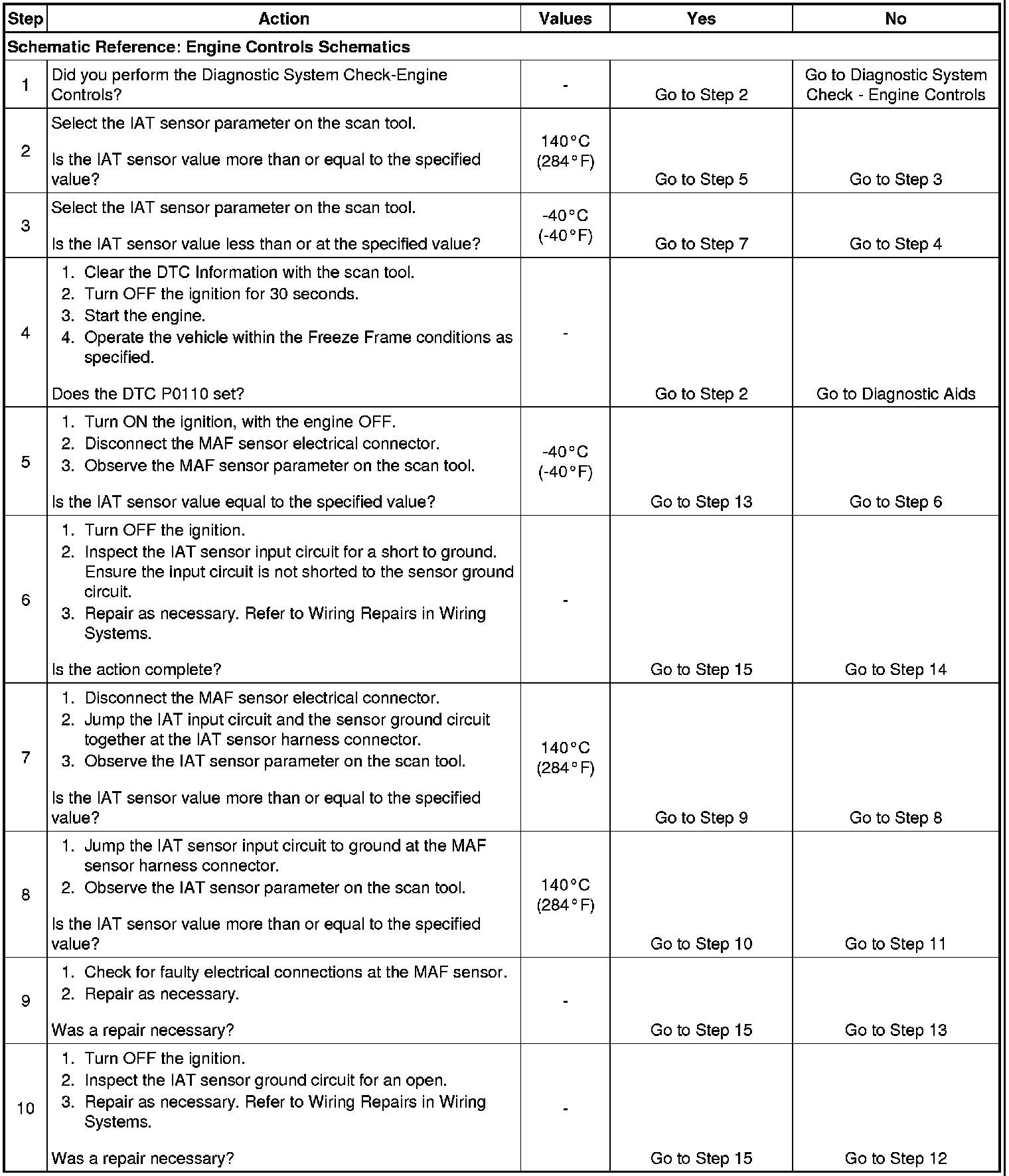 Use the Temperature vs Resistance table in order to evaluate the possibility of a shifted IAT sensor. A shifted sensor could result in a DTC P0110. Refer to Temperature Versus Resistance (Electrical Specifications).