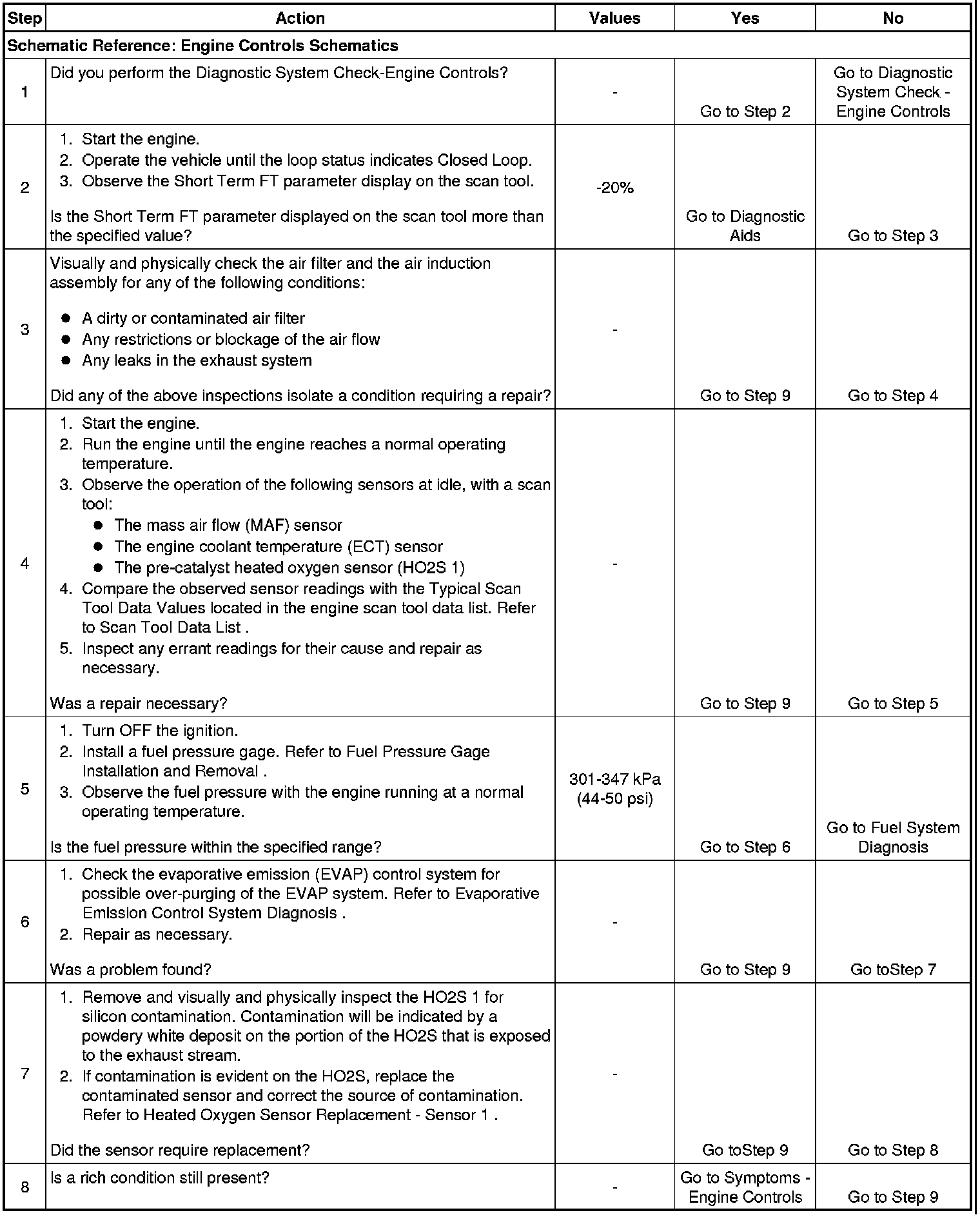 4. Engine control sensors that are found to be out range (skewed) or fixed, can cause the engine to run rich. Inspect the performance of the MAF sensor. Inspect for air restrictions and air inlet leaks near the MAF sensor. If the HO2S voltage is fixed low, while the fuel trim is constantly high, check the MAF sensor circuits for resistance. High circuit resistance can cause the sensor to read the incorrect volume of air, resulting in the wrong fueling condition. Refer to the applicable sensor DTC table for direction in diagnosing any possible sensor error.