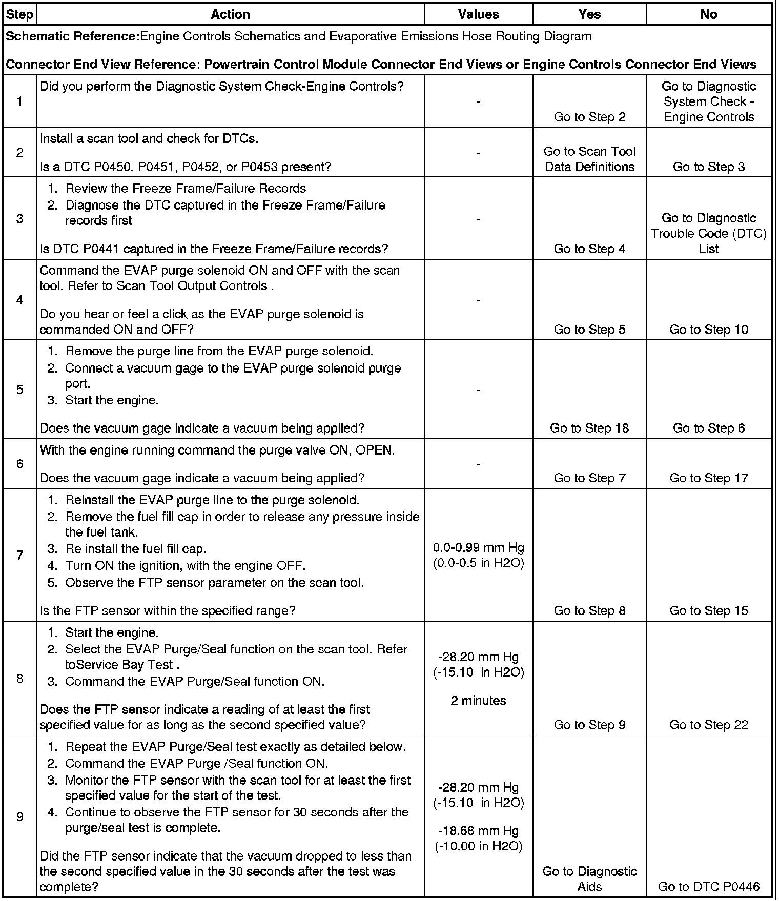 9. This step tests for a blockage or restriction in the EVAP canister vent valve and hoses. If the vacuum does not drop to less than -18.68 mm Hg (-10.0 inches H2O) after 30 seconds, there is a faulty condition in the EVAP vent system. The EVAP vent portion of the EVAP control system is diagnosed in DTC P0446.