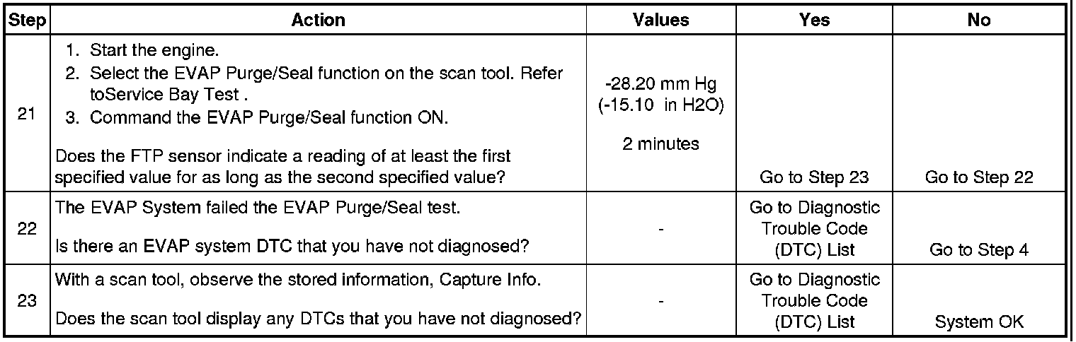 21. This step uses the EVAP Purge/Seal function to test for the correct operation of the EVAP canister vent solenoid, the pressure switching solenoid, and the purge solenoid. Using the EVAP Purge/Seal function also tests for leaks by allowing the technician to seal the system and monitor the FTP sensor.