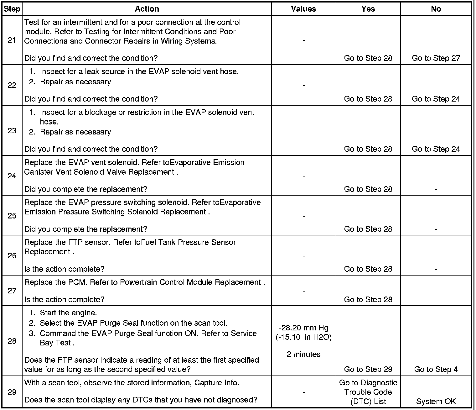 28. This step uses the EVAP Purge/Seal function to test for the correct operation of the EVAP canister vent solenoid, the pressure switching solenoid, and the purge solenoid. Using the EVAP Purge/Seal function also tests for leaks by allowing the technician to seal the system and monitor the FTP sensor.