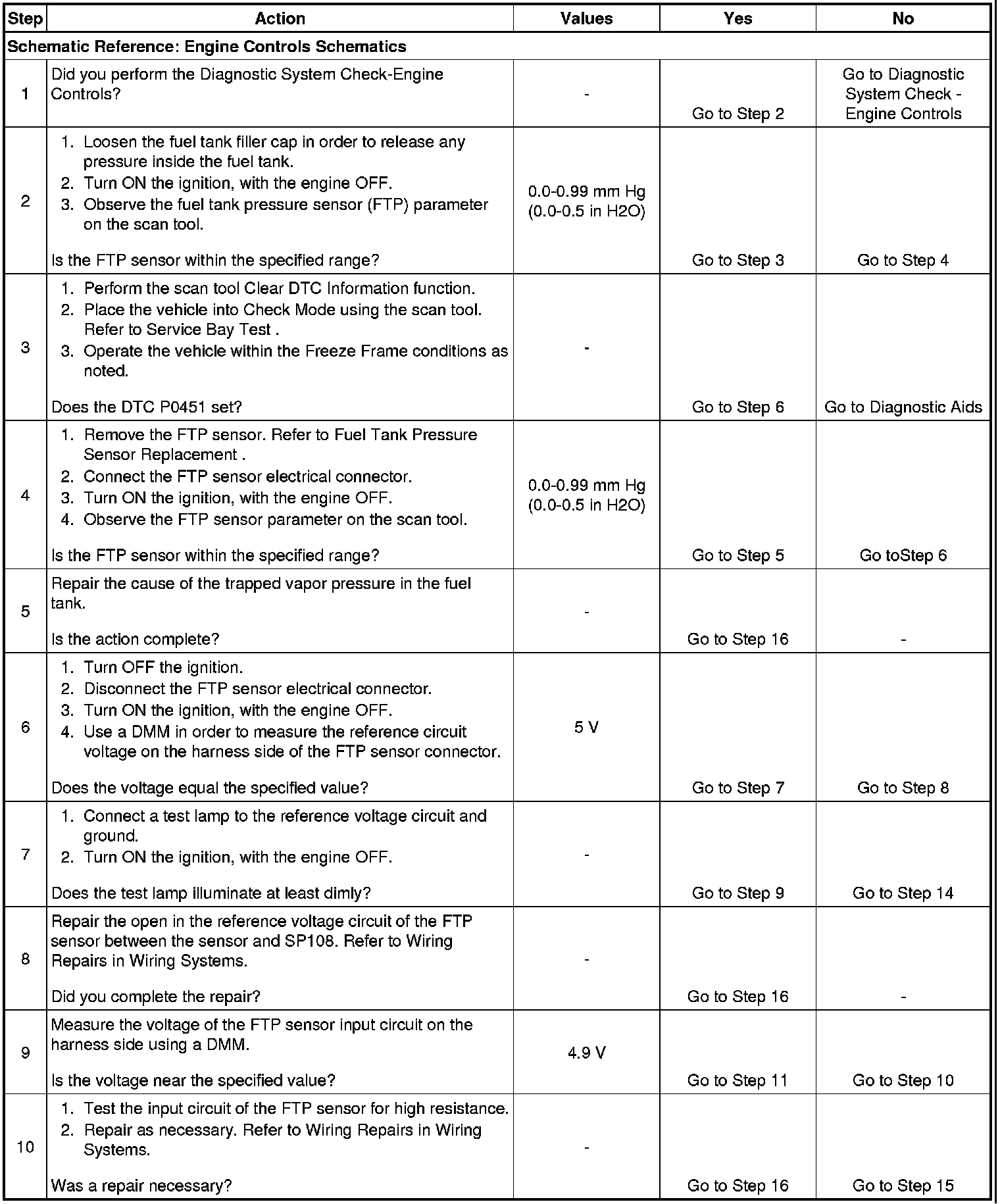 The DTC P0451 Fuel Tank Pressure (FTP) Sensor Performance diagnostic checks the accuracy of the FTP sensor signal. The evaporative emission (EVAP) control system prevents the emission of the fuel vapors. The fuel vapor generated in the fuel tank while driving or idling enters the EVAP canister where a charcoal element absorbs and stores the fuel vapor. When certain engine operating conditions are met the powertrain control module (PCM) purges the EVAP canister of stored vapors by turning ON the EVAP canister purge valve.