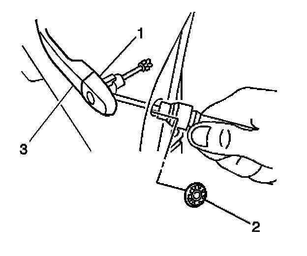 1. Install the door lock cylinder (1) to the outside door handle (3). Secure the lock cylinder with the torx screw.