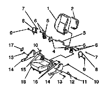 3. Remove the outer and inner seat back recliner trim panels (8). Refer to Seat Back Recliner Outer Trim Panel Replacement - Front Seat (Seat Back Recliner Outer Trim Panel Replacement - Front Seat) and Seat Back Recliner Inner Trim Panel Replacement - Front Seat (Seat Back Recliner Inner Trim Panel Replacement - Front Seat) .