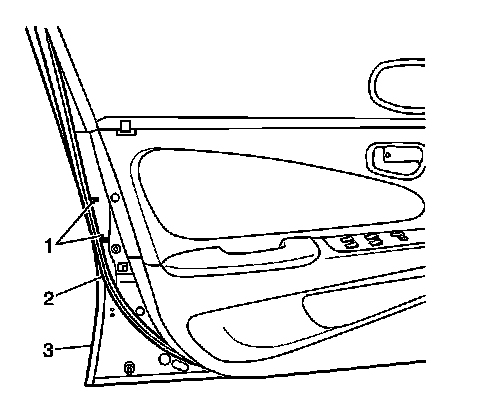 1. Install the front door weatherstrip (2) to the door (3). Ensure that the plastic retainers (1) are completely engaged.