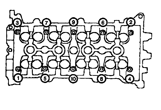 7. Progressively torque the cylinder head bolts using two steps in the sequence shown.