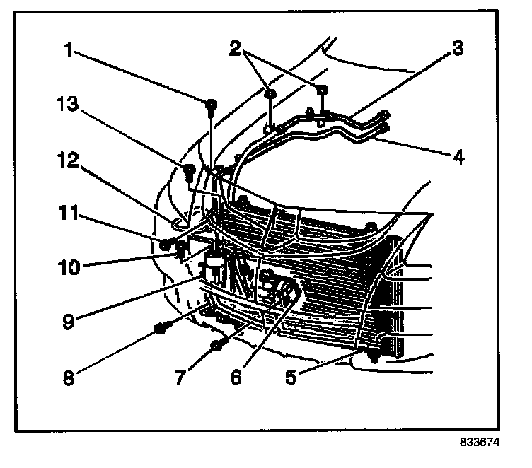2. Remove the bolt (11) and the condenser inlet tube (12) from the condenser.