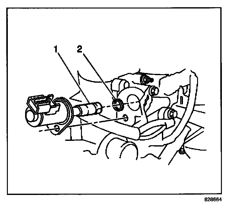 9. Remove the rocker arm oil control solenoid valve (1) and the O-ring (2) from the cylinder head.