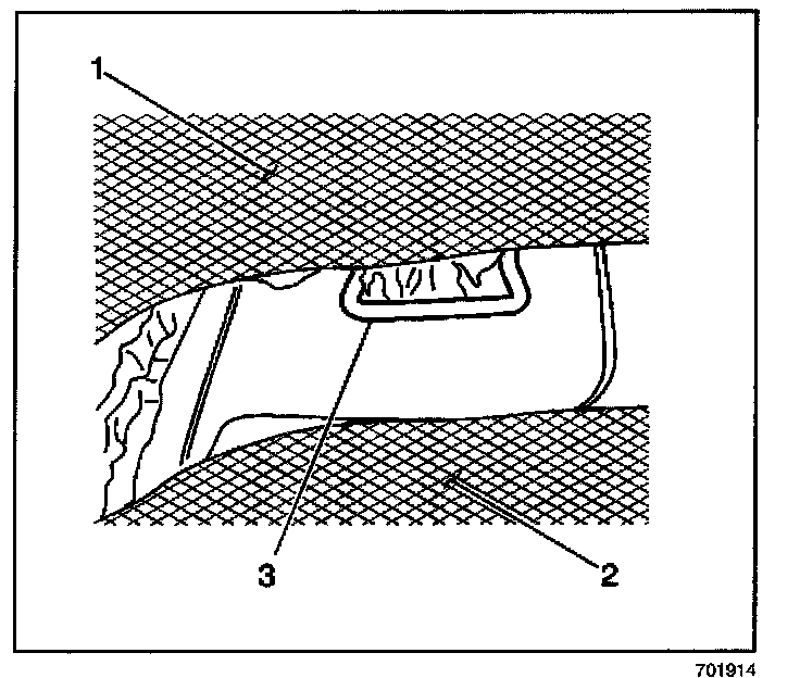 The vehicle is also equipped with a lower child seat anchor bracket (3) for each rear seat position. The lower brackets (3) are located below the rear seat back cushion (1), behind the rear seat cushion (2).