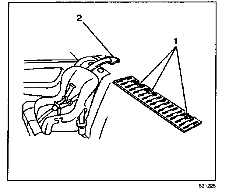 If the child seat has a top strap (2) it must be anchored to one of the upper anchor brackets (1). If the child seat has a bottom strap it must be anchored to one of the lower anchor brackets.