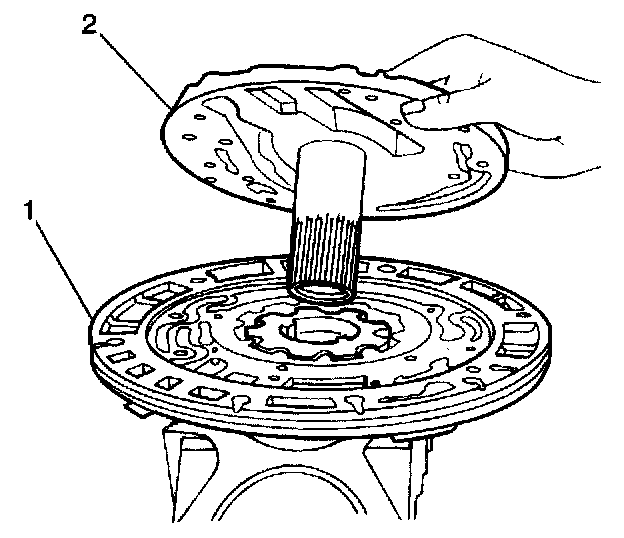 3. Remove the fluid pump thrust washer (2) from the rear of the stator shaft cover (1).