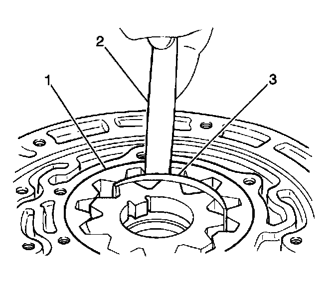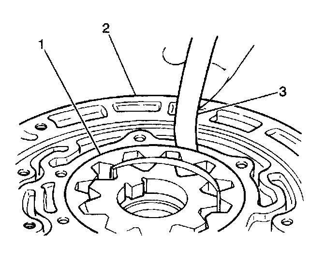 12. Use a J34673 and a feeler gage (1) in order to measure the fluid pump drive gear (3) and the fluid pump driven gear (2) side clearance.