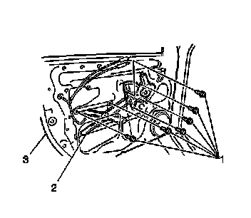 2. Install the window regulator (2) to the door (3). Secure the regulator with the 6 bolts (1).