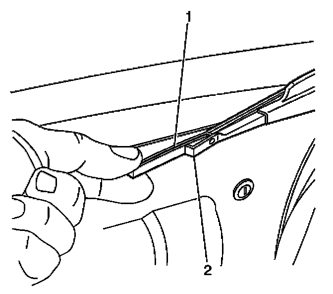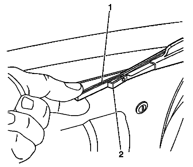 1. Slide the rear window wiper blade insert (1) completely through the rear window wiper blade (2) until the insert (1) snaps into place and locks.